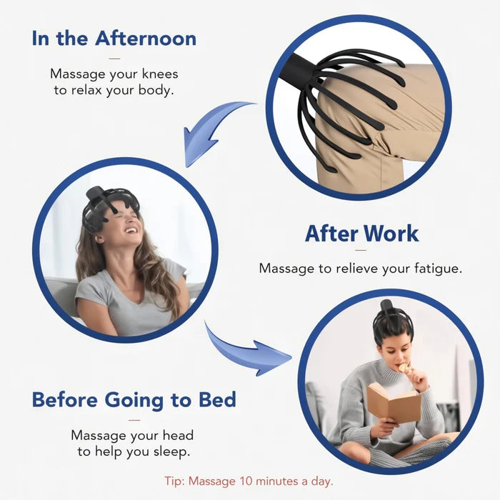 - Gently stimulates pressure points across the scalp, neck, and shoulders.